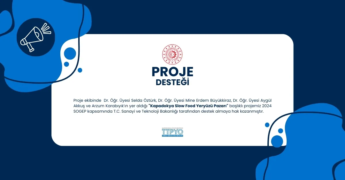 Ahiler Kalkınma Ajansı’nın (AHİKA) katkı sunduğu, ekibinde; Dr. Öğr. Üyemiz Mine Erdem Büyükkiraz, Dr. Öğr. Üyemiz Selda Öztürk, Dr. Öğr. Üyemiz Aygül Akkuş ve Arzum Karabıyık'ın yer aldığı, Kapadokya’da, iyi, temiz ve adil üretim çerçevesinde yerel tarımsal ürün üreticisi kadınların ürünlerini maddi değerinde ve doğrudan ilgili tüketiciye satış yapma imkânı sunarak ekonomik hayata entegrasyonlarını sağlamayı, yaşam kalitelerinin artırmayı ve kazanç elde etmelerini amaçlayan “Kapadokya Slow Food Yeryüzü Pazarı” başlıklı projemiz, 2024 SOGEP kapsamında T.C. Sanayi ve Teknoloji Bakanlığı tarafından desteklenmeye hak kazandı.