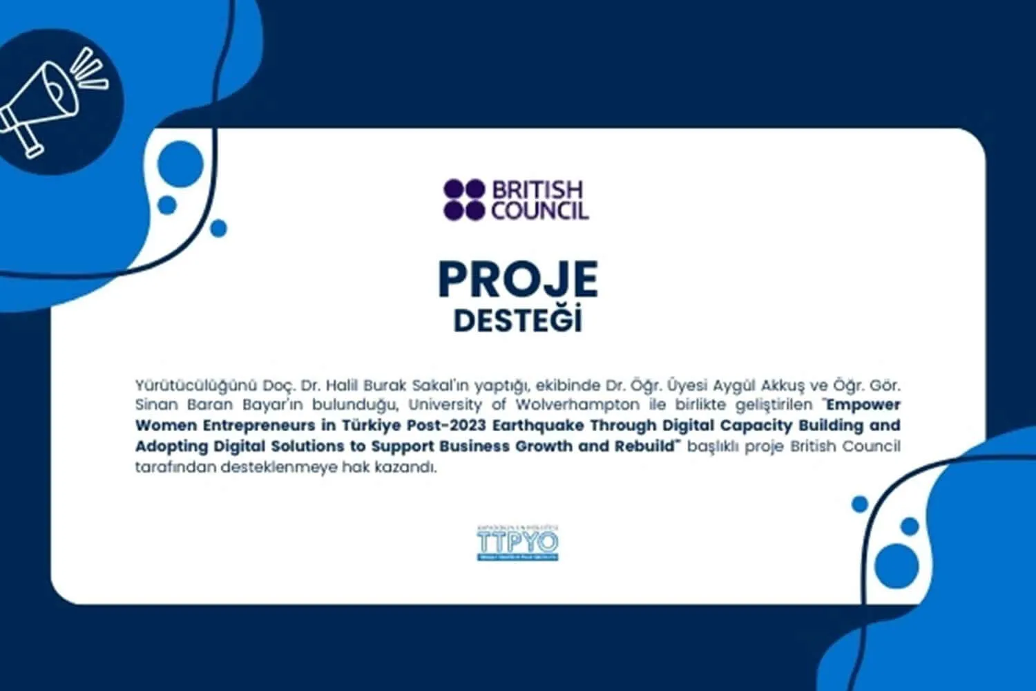 Yürütücülüğünü Doç. Dr. Halil Burak Sakal'ın yaptığı, ekibinde Dr. Öğr. Üyesi Aygül Akkuş ve Öğr. Gör. Sinan Baran Bayar'ın bulunduğu, University of Wolverhampton ile geliştirilen ve British Council’ın destekleyeceği projemiz, 6 Şubat 2023 tarihinde Kahramanmaraş merkezli yaşanan depremlerden en çok etkilenen Hatay ilindeki kadın girişimcilerin dijital becerilerini geliştirerek, sürdürülebilir işletme büyümesine ve ekonomik toparlanmaya destek olmayı hedeflemektedir.