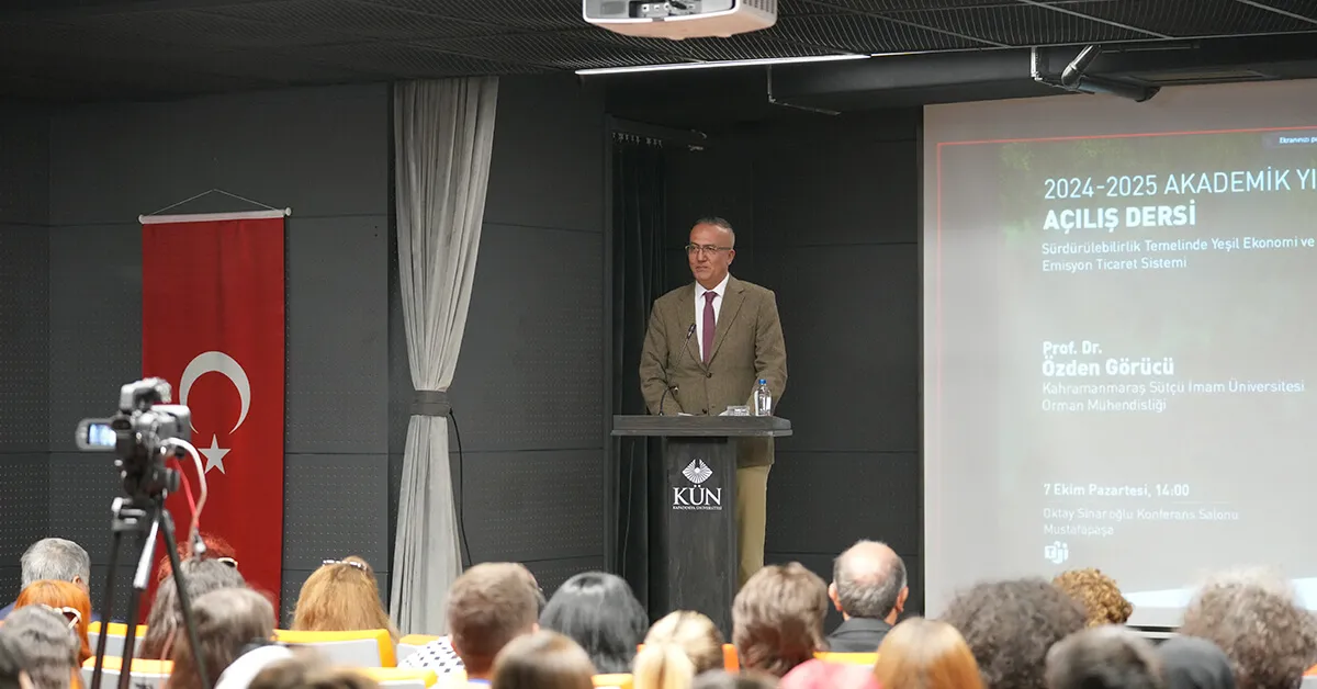 Üniversitemizin 2024-2025 akademik yılı açılış dersini Kahramanmaraş Sütçü İmam Üniversitesi Öğretim Üyesi Prof. Dr. Özden Görücü verdi. Görücü, “Sürdürülebilirlik Temelinde Yeşil Ekonomi ve Emisyon Ticaret Sistemi” başlıklı sunumunda öğrencilere ve öğretim elemanlarına seslendi.